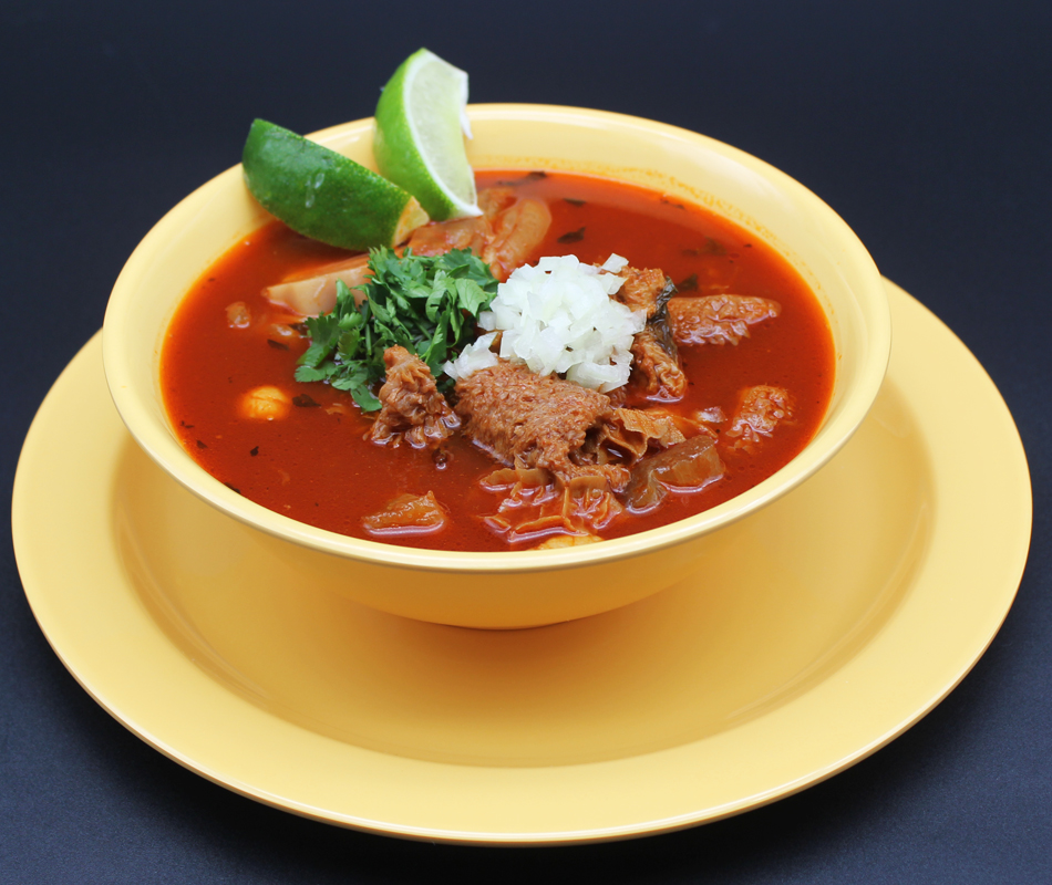 Pork hominy stew, served with tortillas, cilantro, onion & lime