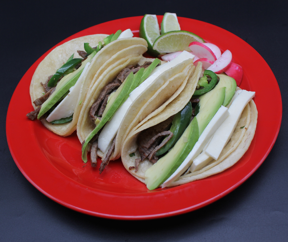 Fresh tortilla or flour tortilla, oaxaca cheese, tomato, lettuce, avocado, sour cream, cotija cheese