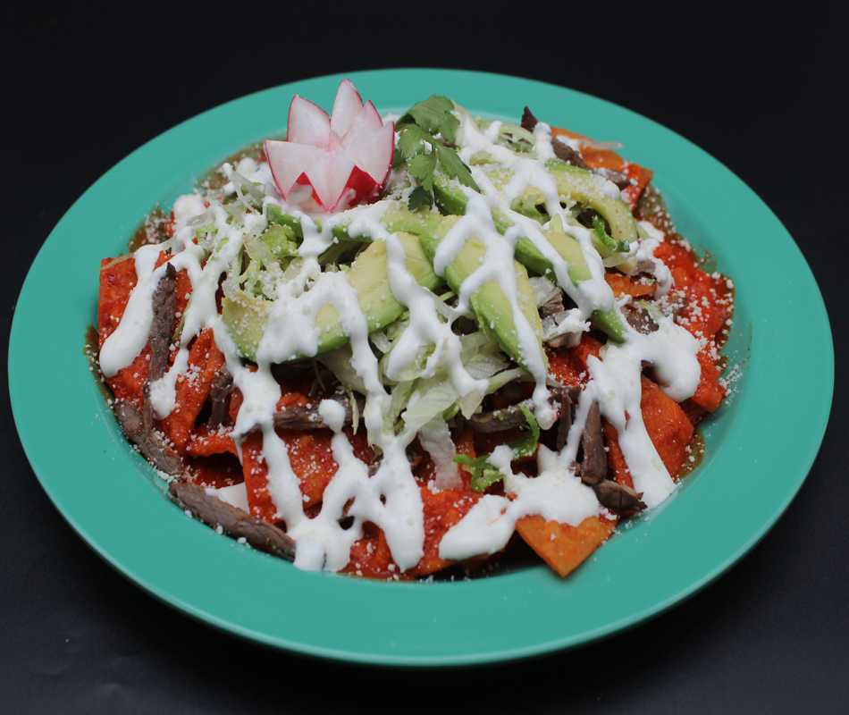 Corn fried tortilla in a green or red sauce, lettuce, avocado, sour cream & cotija cheese [Add meat $3.00 eggs $2.00]